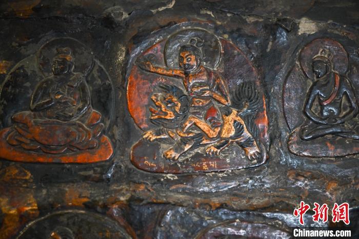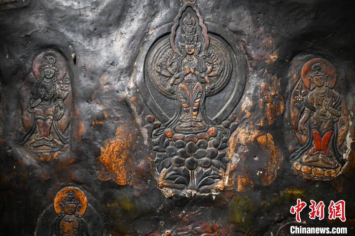 4月27日,記者探訪了當(dāng)雄縣貢堂鄉(xiāng)沖嘎?tīng)柎蹇雕R寺的瑪尼拉康?,斈崂凳窃撍鲁扌卸粗獾脑缙谧诮袒顒?dòng)場(chǎng)所,也是寺院里最古老的建筑。這里保存著令人驚嘆的石刻造像墻,這些石刻距今已有三百年歷史?,斈崂低庥^普通,但其室內(nèi)六面墻上整齊地貼滿了浮雕石刻板,共計(jì)1213塊(僅一塊缺失)。石刻內(nèi)容豐富,涵蓋了藏傳佛教各宗各派的本尊、祖師、佛母菩薩等,造型多姿多樣,線條清晰流暢。這處石刻造像墻對(duì)于研究西藏傳統(tǒng)雕刻、藏傳佛教以及歷史具有重大意義。中新社記者 貢嘎來(lái)松 攝