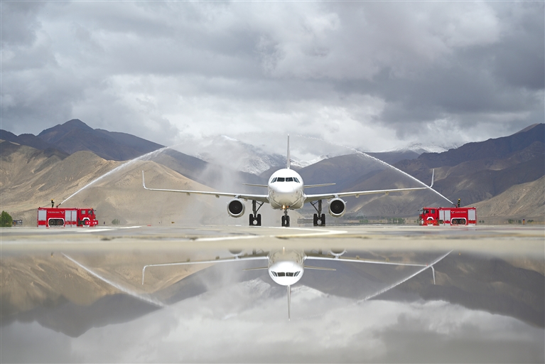 圖為5月1日,“上海—日喀則”航線首航飛機(jī)在日喀則和平機(jī)場(chǎng)通過水門。記者 扎西頓珠 攝