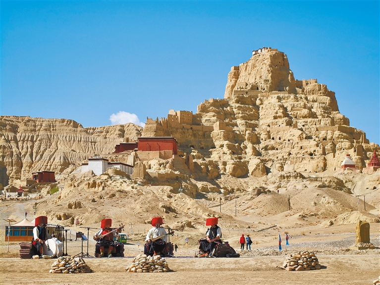 圖為5月19日,朵熱樂(lè)隊(duì)在札達(dá)縣古格王國(guó)遺址前彈奏民俗樂(lè)曲。記者 洛桑旦增 攝