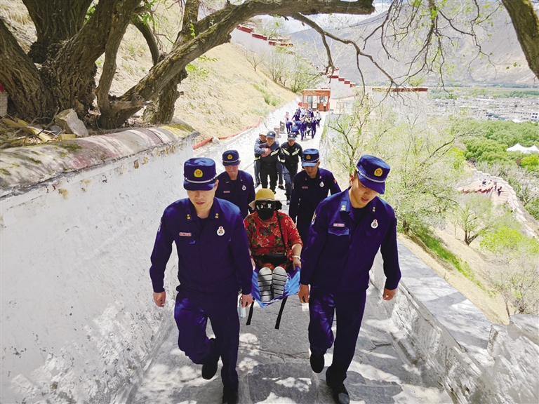 消防員用擔(dān)架抬著殘疾人士參觀布達(dá)拉宮。