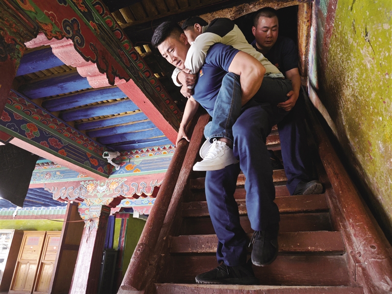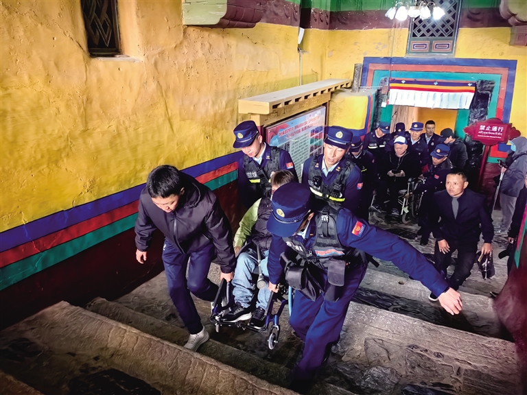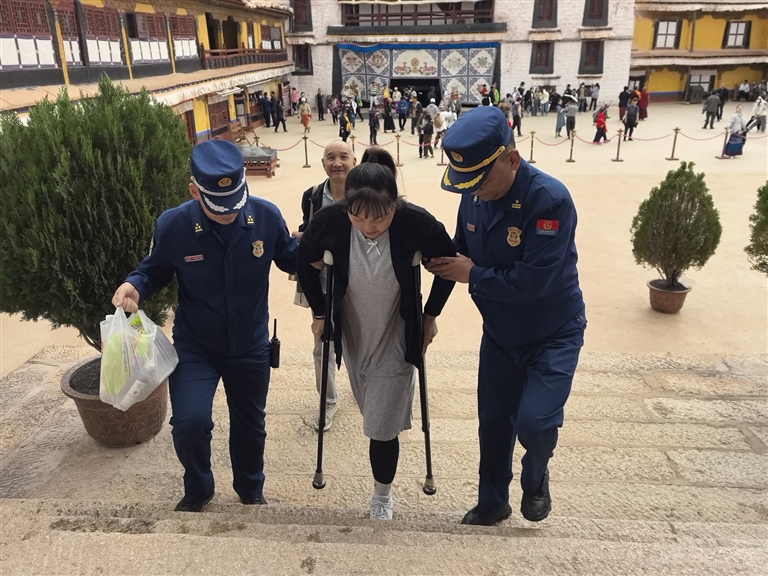 2024年,消防救援站接到一項特殊任務(wù)——幫助19名來自四川的殘疾人士參觀布達(dá)拉宮。面對15位肢體殘疾人和4位視力殘疾人,尤其是6位重度輪椅使用者和2位全盲者,消防員們沒有絲毫猶豫接下任務(wù)。布達(dá)拉宮海拔高、樓梯多、內(nèi)部道路狹窄陡峭,消防員們就用擔(dān)架抬、輪流背的方式帶領(lǐng)他們游覽。同時,消防員化身“導(dǎo)游”,每到一處都詳細(xì)講解布達(dá)拉宮的歷史文化,耐心解答疑問,讓這些特殊游客感受到了溫暖與尊重。