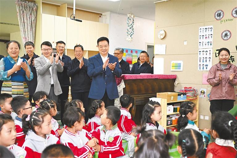 初夏,萬物并秀,生機(jī)勃發(fā),拉薩市實(shí)驗(yàn)小學(xué)書聲瑯瑯。王君正走進(jìn)校園,察看學(xué)校環(huán)境,參觀自然、閱讀、書法、體育等教育成果展示,了解學(xué)校歷史沿革、建設(shè)發(fā)展、教育教學(xué)等情況。他指出,習(xí)近平總書記高度重視、親切關(guān)懷少年兒童和少先隊(duì)工作,多次參加少先隊(duì)活動(dòng),發(fā)表重要講話、作出重要指示。5月27日,習(xí)近平總書記致信祝賀中國少年先鋒隊(duì)第九次全國代表大會(huì)召開,殷切寄語廣大少年兒童,飽含著對(duì)大家的深切關(guān)愛。要加強(qiáng)愛國主義教育,講好思政課,著力講好黨的故事、革命的故事、英雄的故事,時(shí)刻把祖國和人民放在心中,不忘初心、童心向黨,從小聽黨話、感黨恩、跟黨走;要積極推廣國家通用語言文字,把鑄牢中華民族共同體意識(shí)根植少年兒童心靈深處,引導(dǎo)他們爭(zhēng)做民族團(tuán)結(jié)的小石榴籽,爭(zhēng)當(dāng)學(xué)習(xí)和踐行社會(huì)主義核心價(jià)值觀的小模范。圖書館內(nèi),“紅領(lǐng)巾小書蟲”讀書分享活動(dòng)正在進(jìn)行,孩子們圍坐在一起,與定日縣長所鄉(xiāng)完全小學(xué)學(xué)生視頻連線,共同分享喜歡的書籍,王君正認(rèn)真傾聽、親切詢問,向孩子們贈(zèng)送書籍?!白鎳奈磥砗拖M谀銈兩砩?,要熱愛祖國、好好學(xué)習(xí)、天天向上,從小培養(yǎng)良好的道德情操?!蓖蹙膭?lì)他們說,要多讀書、讀好書,從書中汲取智慧和營養(yǎng),將來做對(duì)國家、對(duì)人民、對(duì)社會(huì)有用的人。