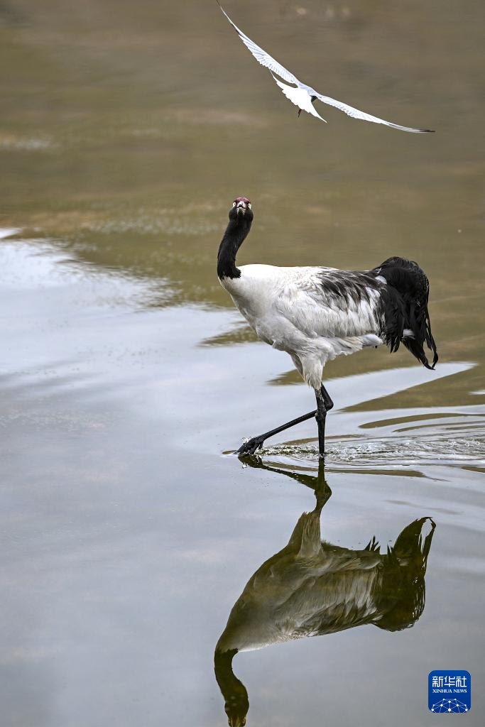 6月4日拍攝的在那曲市申扎縣周邊濕地里棲息的黑頸鶴。新華社記者 旦增尼瑪曲珠 攝