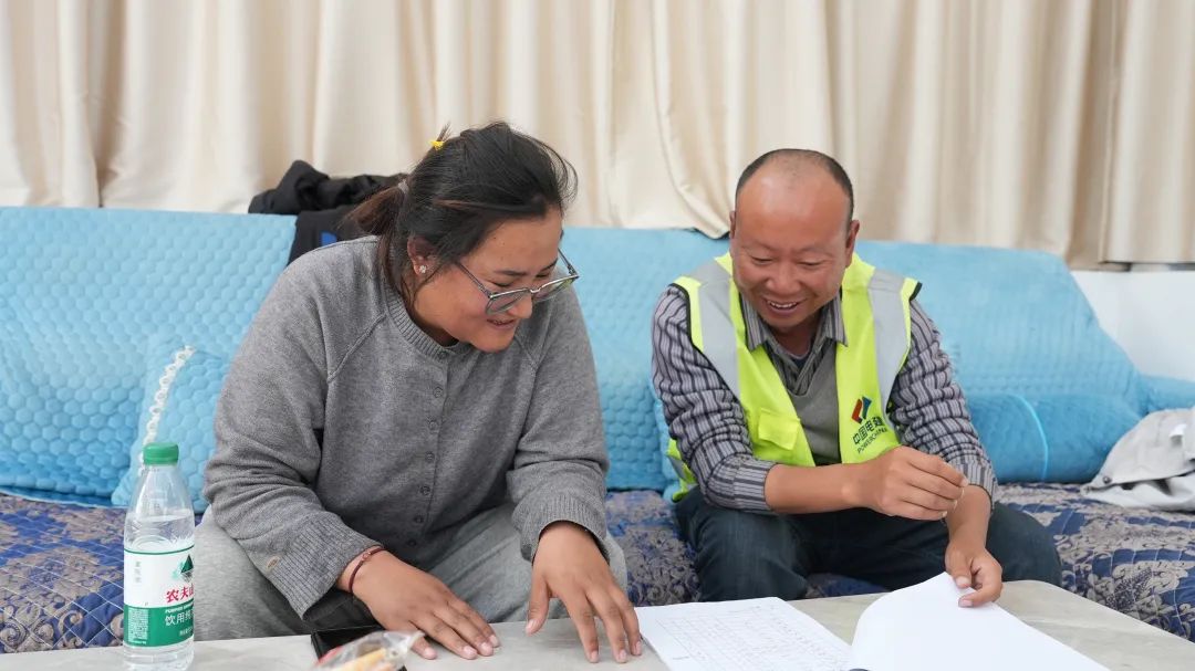 飯后,大家迅速投入工作,“拉巴家的房子地圈梁模板做完了嗎?”普布普尺邊詢問,邊認真記錄。祝波耐心細致地介紹每一戶的施工情況。這個00后的小姑娘,在近幾個月與祝波的相處中,能力不斷提升,兩人在工作中配合默契,宛如老搭檔。