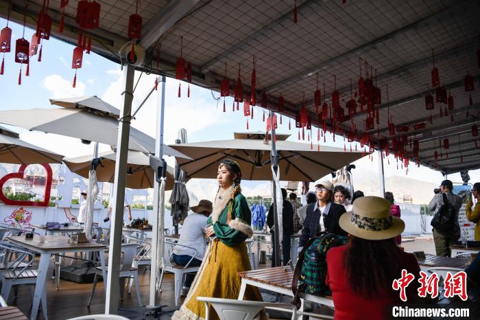 7月7日,游客在西藏拉薩市的一家景觀咖啡廳等待拍攝以布達(dá)拉宮為背景的 “旱地拔蔥” 。中新社記者 貢嘎來松 攝
