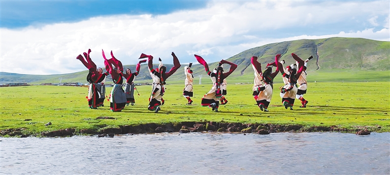 近年來(lái),那曲文旅局以那曲傳統(tǒng)鍋莊舞展演為突破口,進(jìn)一步推進(jìn)那曲優(yōu)秀傳統(tǒng)文化創(chuàng)造性轉(zhuǎn)化和創(chuàng)新性發(fā)展,全力打響那曲鍋莊舞品牌?!D為那曲市群眾藝術(shù)鍋莊隊(duì)隊(duì)員在草原上跳鍋莊舞。(那曲市文旅局非遺處提供)