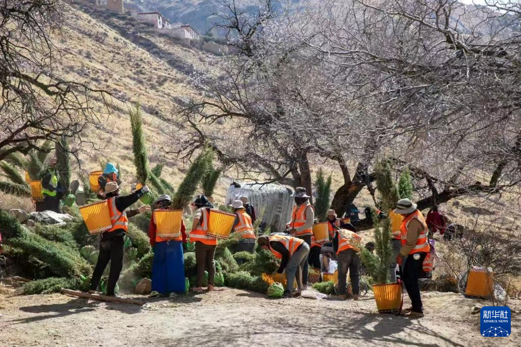 綠化養(yǎng)護(hù)工人澤仁巴西和同事們一起植樹。(受訪者供圖)