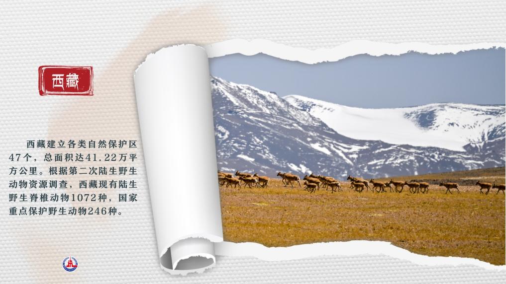 西藏建立各類自然保護(hù)區(qū)47個(gè),總面積達(dá)41.22萬平方公里。根據(jù)第二次陸生野生動(dòng)物資源調(diào)查,西藏現(xiàn)有陸生野生脊椎動(dòng)物1072種,國(guó)家重點(diǎn)保護(hù)野生動(dòng)物246種。