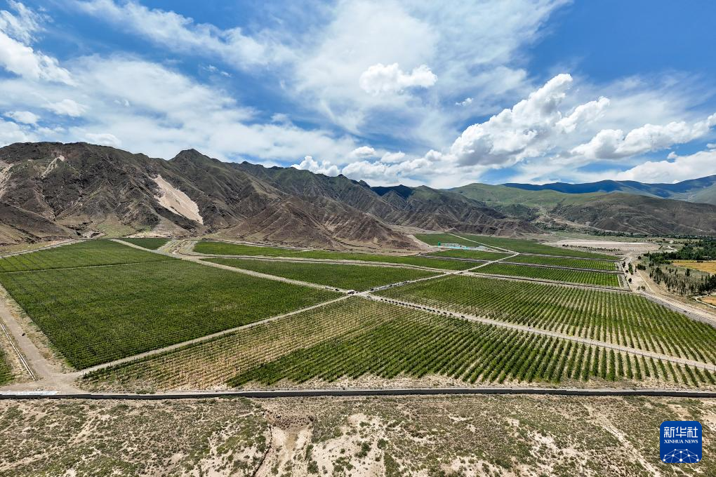 這是西藏扎囊縣的一處矮化蘋果種植園區(qū),采用現(xiàn)代農(nóng)業(yè)滴灌技術,使水資源得到高效利用,還可以用果樹防風固沙,讓沙化地變綠洲(無人機照片,7月19日攝)。新華社記者 李鑫 攝