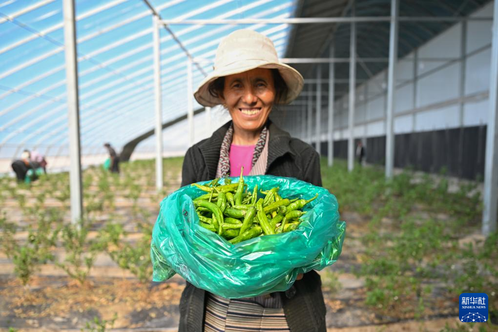 7月19日,西藏扎囊縣綠之源現(xiàn)代農(nóng)業(yè)科技股份有限公司的員工次旺拉吉展示剛采摘下來的有機辣椒。新華社記者 李鑫 攝
