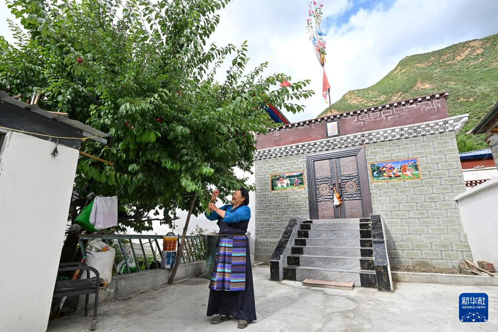 7月21日,63歲的拉丁雪村村民索朗康珠在改造提升后的自家小院內(nèi)摘李子。新華社記者 李鑫 攝