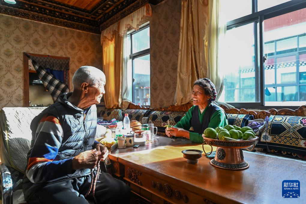 7月21日,58歲的拉丁雪村婦聯(lián)主席格桑德青(右)在自家改造提升后的餐廳里給88歲的父親喬多吉削水果。新華社記者 李鑫 攝