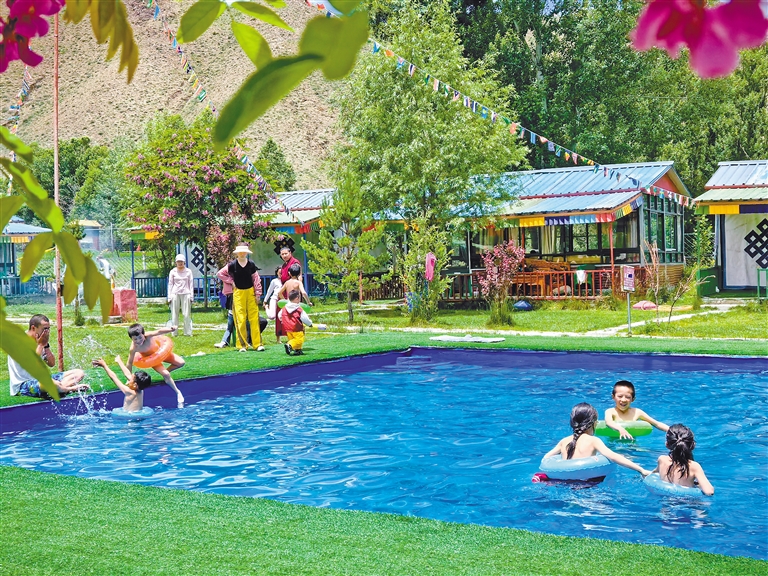 群眾在拉薩市林周縣白定村的林卡營地內(nèi)玩水嬉戲。記者 洛?!z