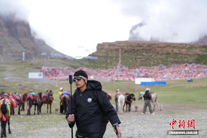 7月21日,一名來自印度的徒步旅行者在岡仁波齊山腳拍攝徒步視頻。張祥毅 攝