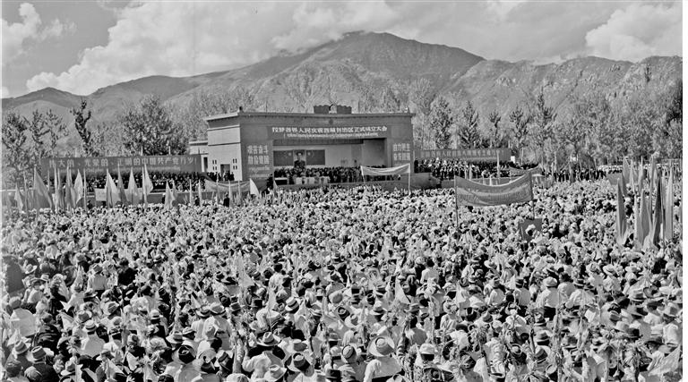 圖為拉薩干部群眾慶祝西藏自治區(qū)正式成立(1965年攝)。