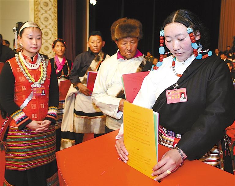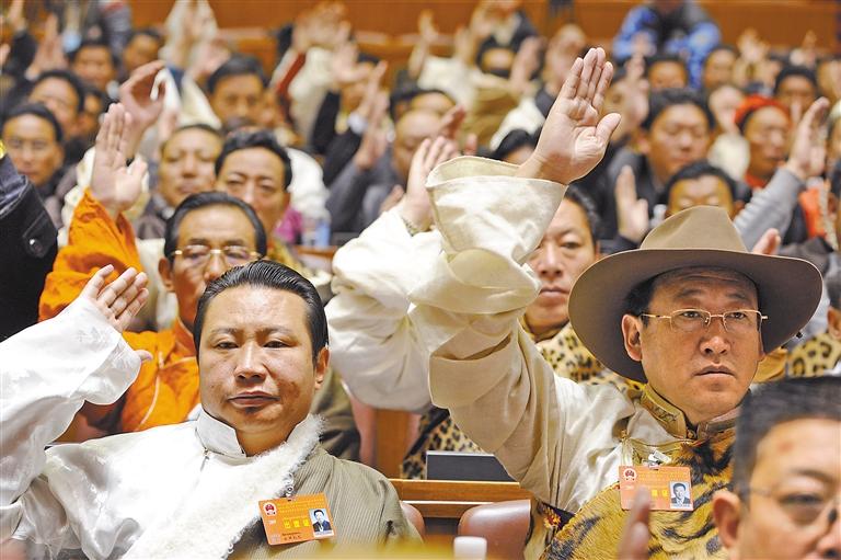 在舊西藏,占總人口不到5%的三大領主(官家、貴族和寺院上層僧侶)占有全部生產(chǎn)資料,而占總人口95%以上的農(nóng)奴和奴隸沒有人身自由。西藏民主改革特別是西藏自治區(qū)成立以來,民族區(qū)域自治制度得到堅決貫徹,各族人民參與民主政治建設的熱情持續(xù)高漲:農(nóng)奴的后代當選人大代表,通過人民代表大會制度參與國家治理;截至目前,全區(qū)四級人大代表42000余人中,藏族和其他少數(shù)民族約占89%;門巴、珞巴等人口不足萬人的民族,在全國及西藏人大均有代表——雪域高原各族兒女依法行使民主權利,真正成為命運的主宰者。