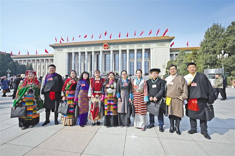 圖為十四屆全國人大三次會議期間,與會西藏的全國人大代表在人民大會堂前合影留念(2025年3月攝)。