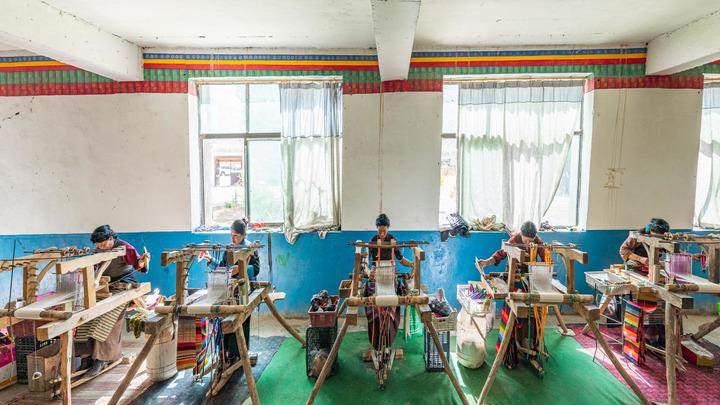 山南市貢嘎縣杰德秀鎮(zhèn)的格桑圍裙農(nóng)牧民專(zhuān)業(yè)合作社里,旦增卓嘎和合作社的婦女在編織“邦典”(2025年4月23日攝)。新華社記者 丁增尼達(dá) 攝