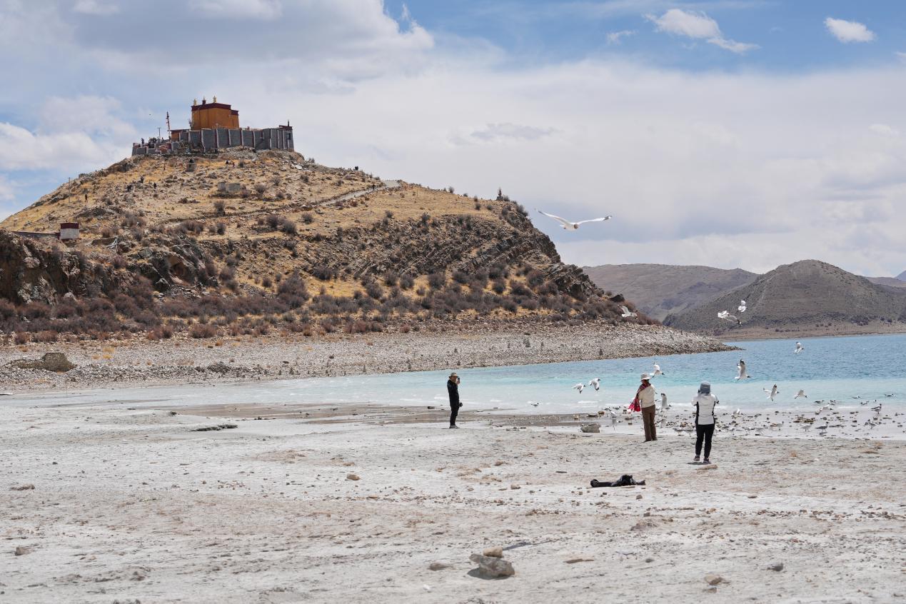 游客在羊卓雍錯(cuò)北岸的日托寺附近投喂棕頭鷗(2024年4月5日攝)。新華社記者 張汝鋒 攝