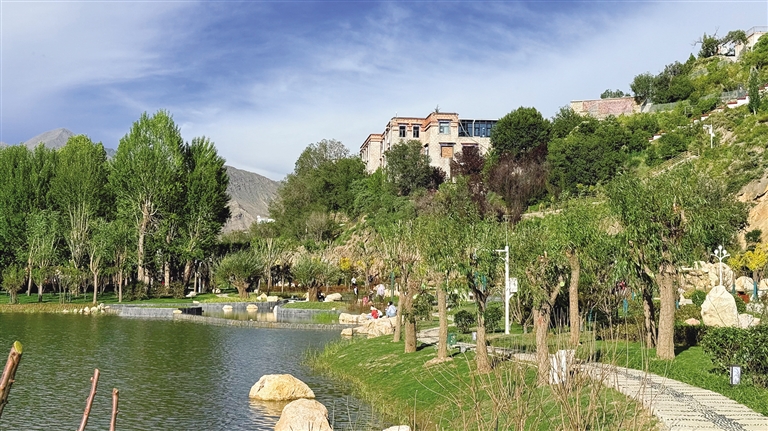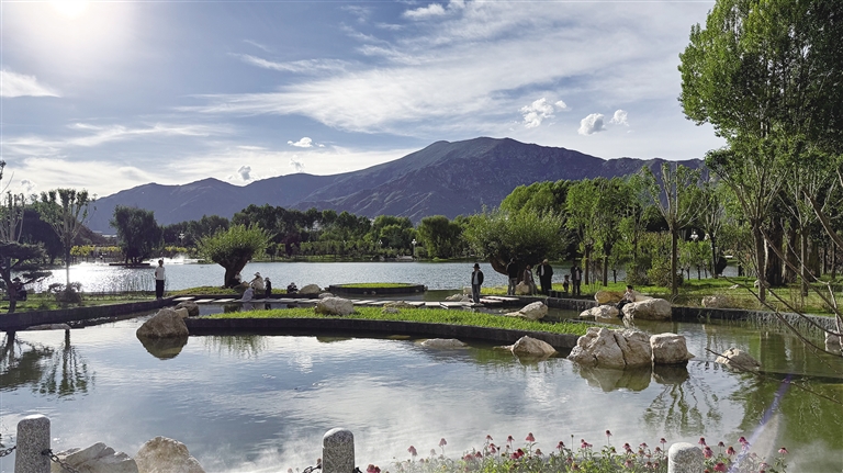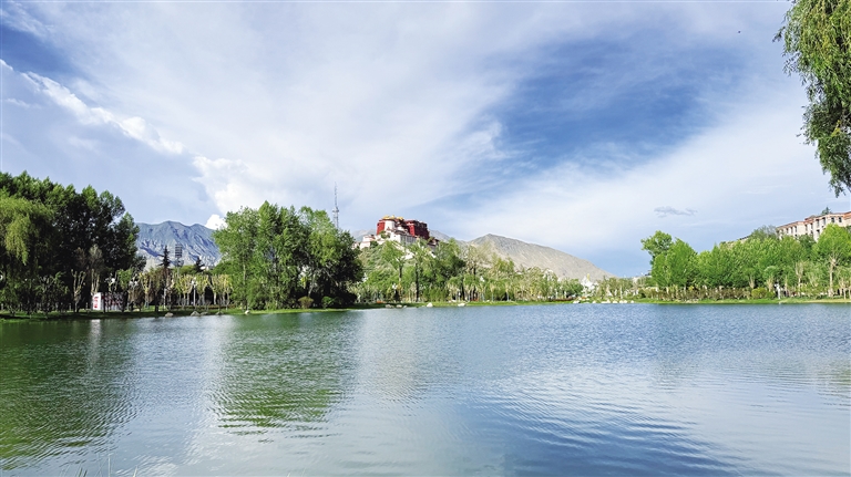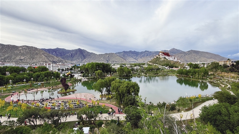 拉薩團(tuán)結(jié)公園坐落于布達(dá)拉宮西麓、藥王山腳下。昔日,這里房屋高低錯(cuò)雜、線纜交錯(cuò)密布、市場(chǎng)喧鬧擁擠、環(huán)境喧囂擾攘,不僅影響城市形象和生態(tài)環(huán)境,還影響出行游玩體驗(yàn)。如今,湖水如碧綢般清澈,岸邊綠樹(shù)成蔭,各類花卉競(jìng)相綻放,昔日雜亂之地已蛻變?yōu)轸浯涿髦?,人文古跡與自然景致相映成趣,共同繪就出“百澤繞城·水城相依”的生態(tài)文明畫(huà)卷。