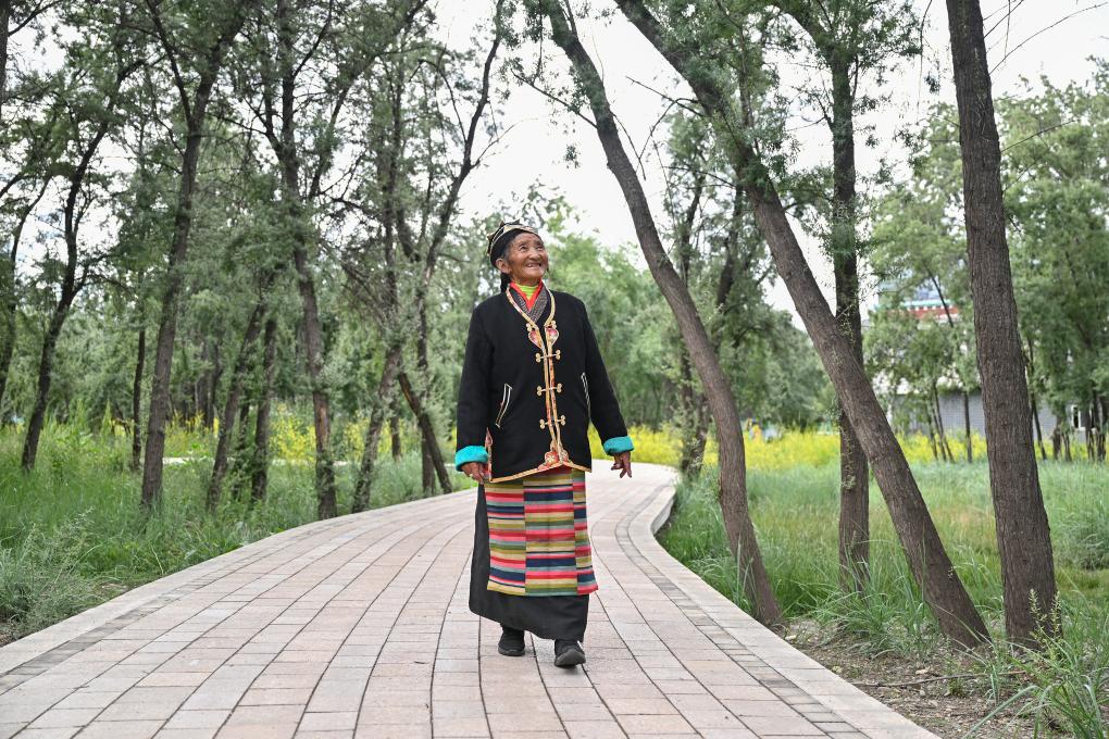 桑旦在隆子縣沙棘林生態(tài)公園內(nèi)散步。新華社記者 李鑫 攝