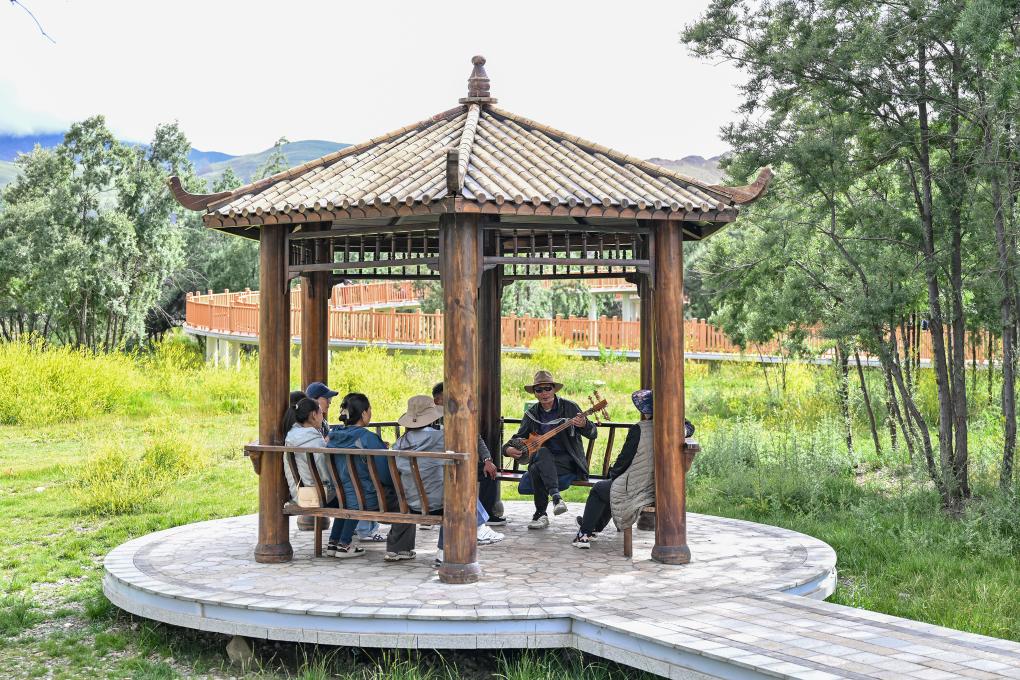 隆子縣居民在沙棘林生態(tài)公園彈奏樂(lè)器。新華社記者 李鑫 攝