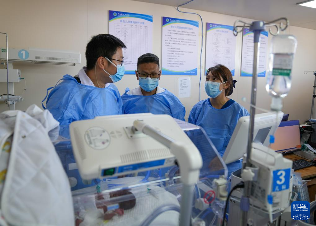 在那曲市人民醫(yī)院新生兒重癥監(jiān)護室,來自大連醫(yī)科大學附屬第一醫(yī)院的援藏醫(yī)生田聰亮(左)與吉美多布杰(中)、護士旦珍合作,為一名早產兒實施機械通氣治療(7月18日攝)。吉美多布杰2003年從四川大學華西醫(yī)學院畢業(yè)來到那曲市人民醫(yī)院工作,他先后和8批援藏專家合作、學習。新華社記者 晉美多吉 攝