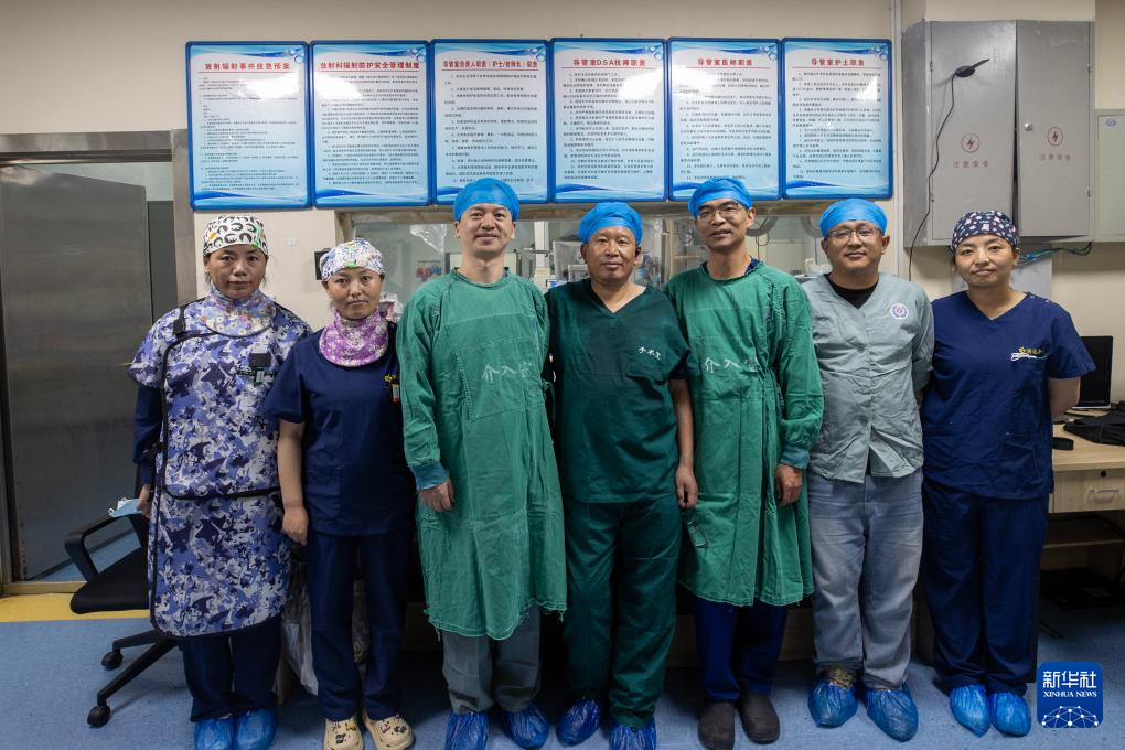 協(xié)和醫(yī)院第十批援藏醫(yī)生王強(左四)、第十一批援藏醫(yī)生蔣青偉(左三)和西藏自治區(qū)人民醫(yī)院醫(yī)生扎西(左一)在拉薩為患者施行內鏡逆行胰膽管造影術(8月5日攝)。新華社記者 姜帆 攝