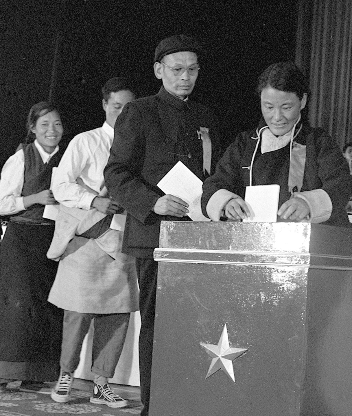 1965年9月,西藏自治區(qū)第一屆人民代表大會(huì)第一次會(huì)議的代表次仁拉姆(右一)正在投票。新華社記者袁克忠攝