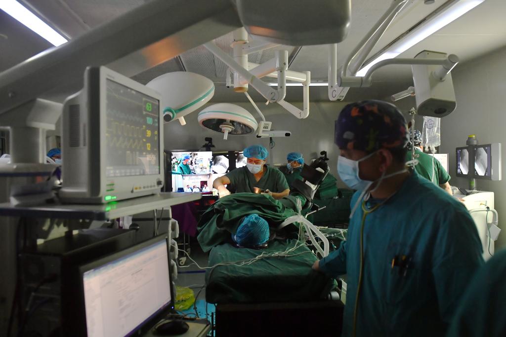 2021年4月19日,拉薩市人民醫(yī)院骨科醫(yī)生在北京積水潭醫(yī)院專家遠(yuǎn)程指導(dǎo)下使用骨科機(jī)器人開展骨科手術(shù)。 新華社記者 孫瑞博 攝