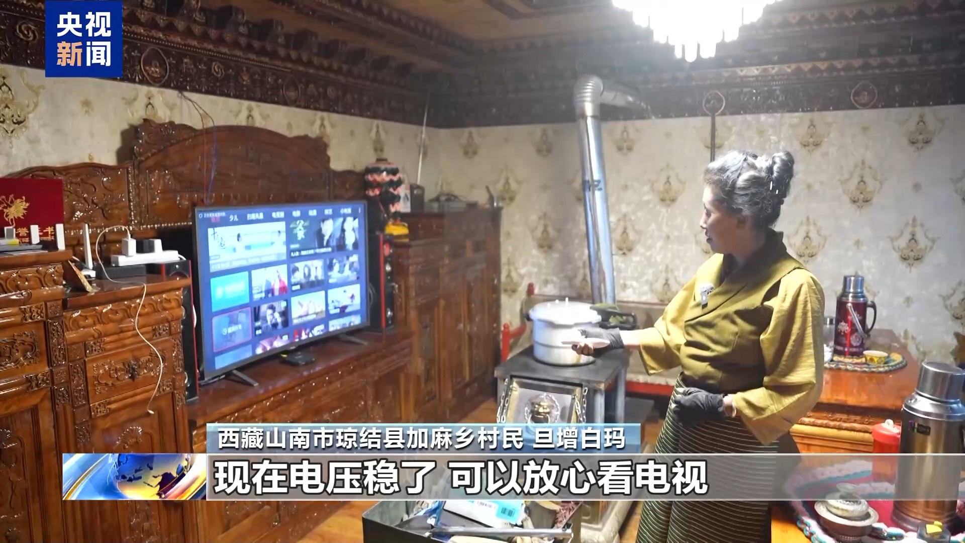 西藏山南瓊結(jié)縣加麻鄉(xiāng)村民 旦增白瑪:現(xiàn)在電壓穩(wěn)了,可以放心看電視。而且還買了很多新家電,冰箱、洗衣機(jī)。