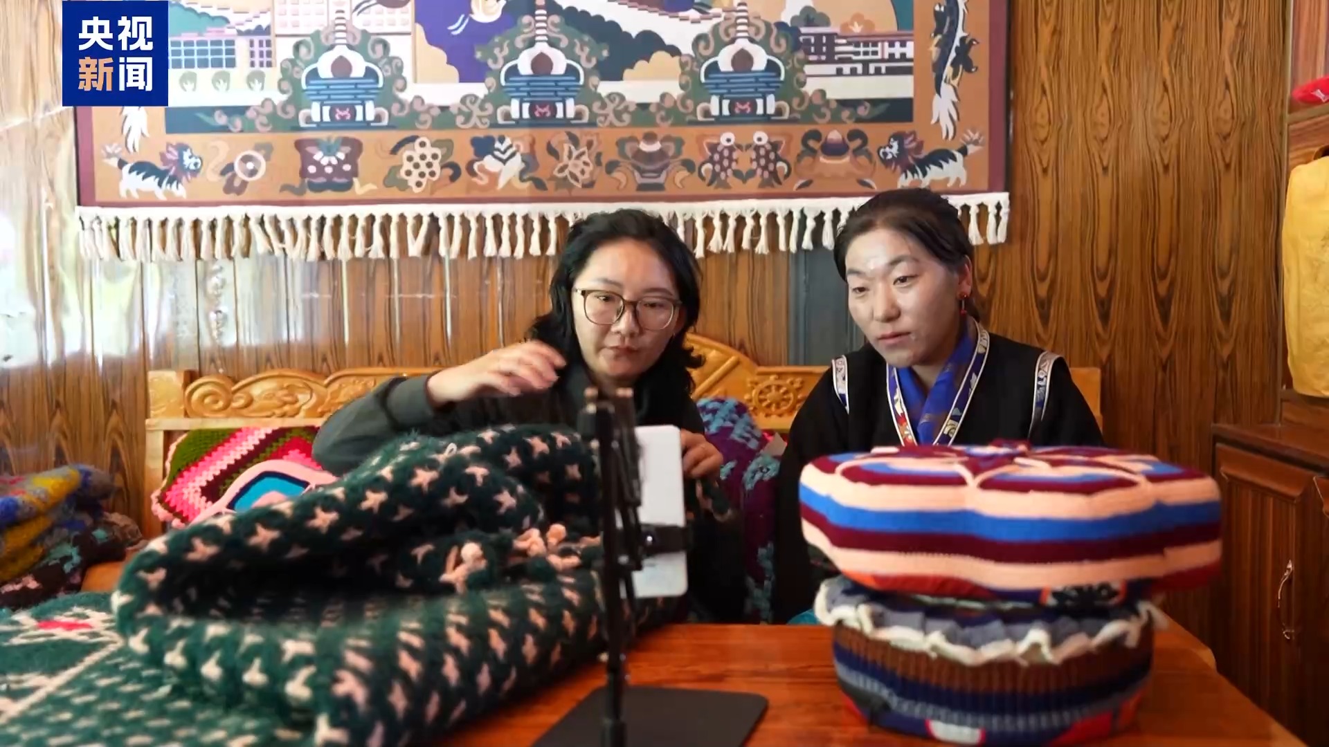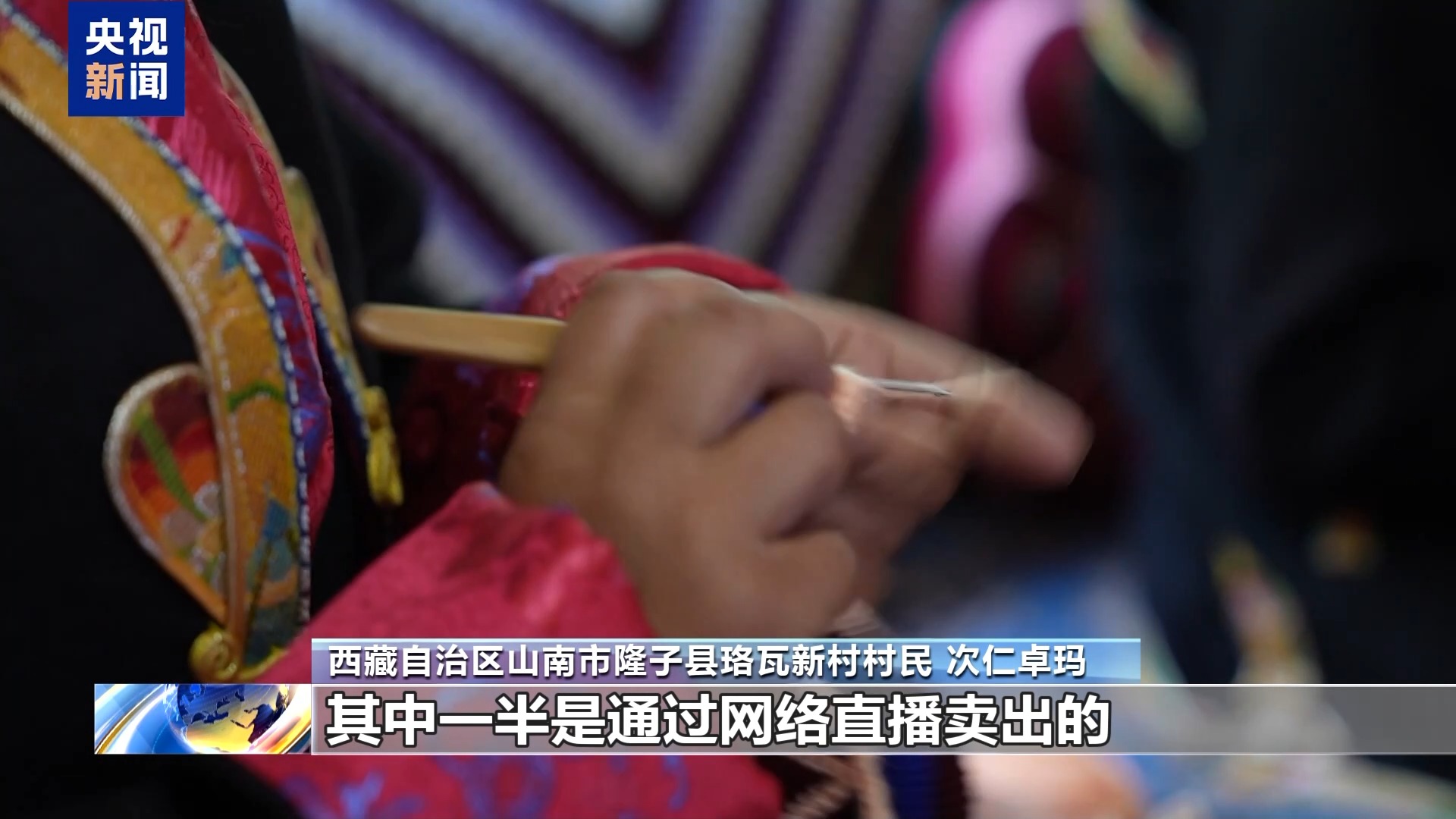 西藏自治區(qū)山南市隆子縣珞瓦新村村民 次仁卓瑪:今年以來(lái),我們已經(jīng)賣出了50多條毛毯,100多個(gè)靠枕,其中一半是通過(guò)網(wǎng)絡(luò)直播賣出的。