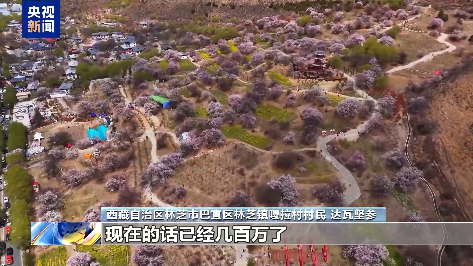 西藏自治區(qū)林芝市巴宜區(qū)林芝鎮(zhèn)嘎拉村村民 達(dá)瓦堅(jiān)參:以前從桃花節(jié)開始搞起來(lái)的時(shí)候,全村收入幾百塊錢到幾千塊錢到幾萬(wàn)塊錢,現(xiàn)在的話已經(jīng)幾百萬(wàn)了。