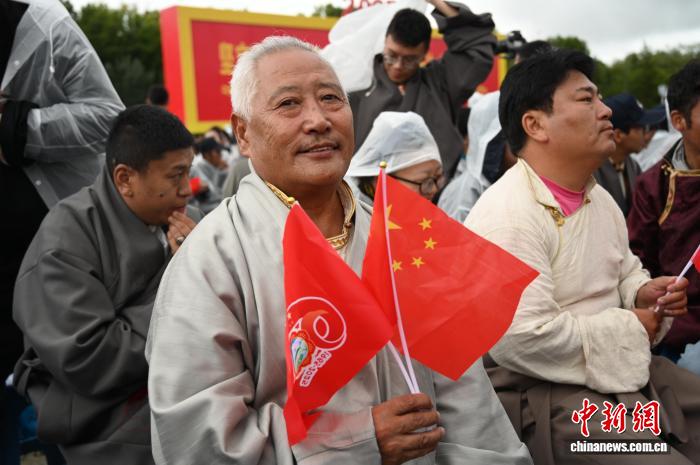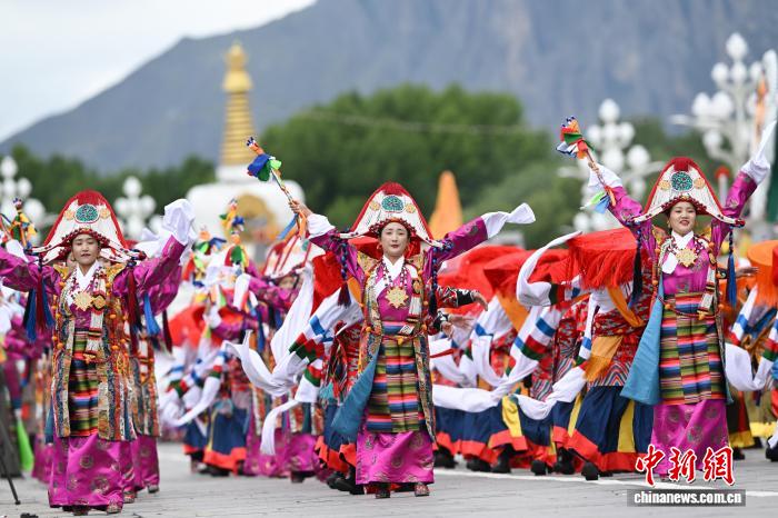 8月21日,拉薩古城居民羅桑群佩在布達(dá)拉宮廣場參加慶?;顒?。中新社記者 趙朗 攝
