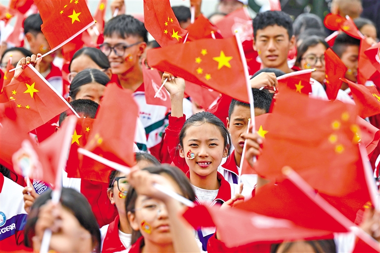 群眾在慶祝大會現(xiàn)場揮舞旗幟。新華社記者 申宏 攝