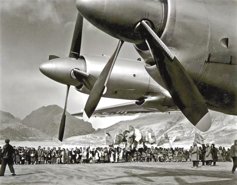 無畏開拓,筑起雪域天路。1955年底,黨中央、國務(wù)院作出開辟北京至拉薩民用航線的重要指示。1956年4月26日,當雄草原上建起了簡易跑道;5月26日,韓琳機組駕駛伊爾-12型飛機從北線試航,穿破層層云障,成功降落在雪山環(huán)抱的當雄機場,填補了我國高高原飛行的空白;9月5日,歷時118天,西藏第一座機場——當雄機場建成。此后的10年間,多次組織試飛。1965年3月1日,民航第一飛行大隊孫權(quán)貴和畢春芳機組駕駛伊爾-18型飛機從北京起飛,次日平穩(wěn)降落當雄機場,北京-成都-拉薩航線正式通航,西藏民航波瀾壯闊的發(fā)展篇章就此開啟。