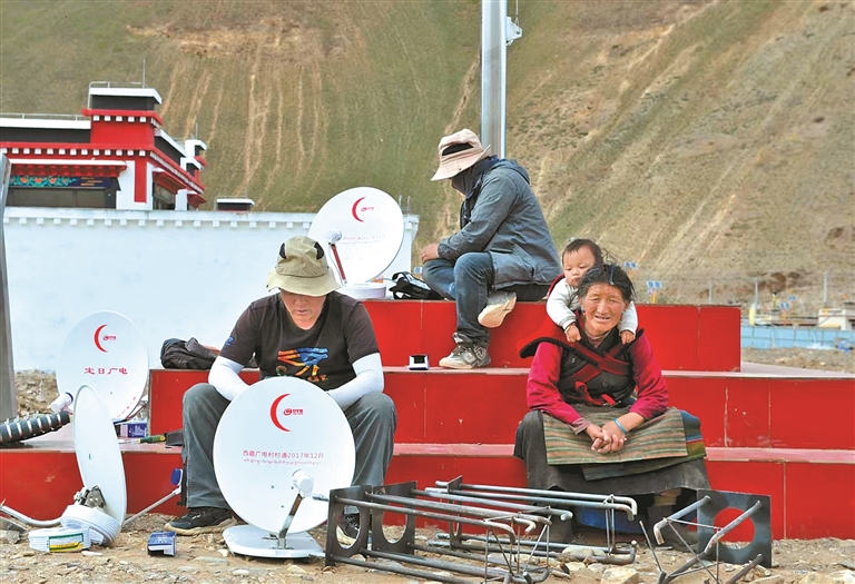 圖為在定日縣措果鄉(xiāng)野江村,工作人員為群眾安裝廣播電視直播衛(wèi)星“戶戶通”設(shè)備。記者 旦增嘎瓦 攝