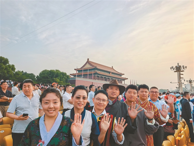 圖為9月3日,西藏代表團(tuán)成員在觀禮臺(tái)上合影留念。記者 央金 通訊員 強(qiáng)巴扎西 攝