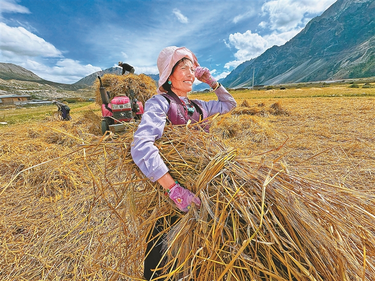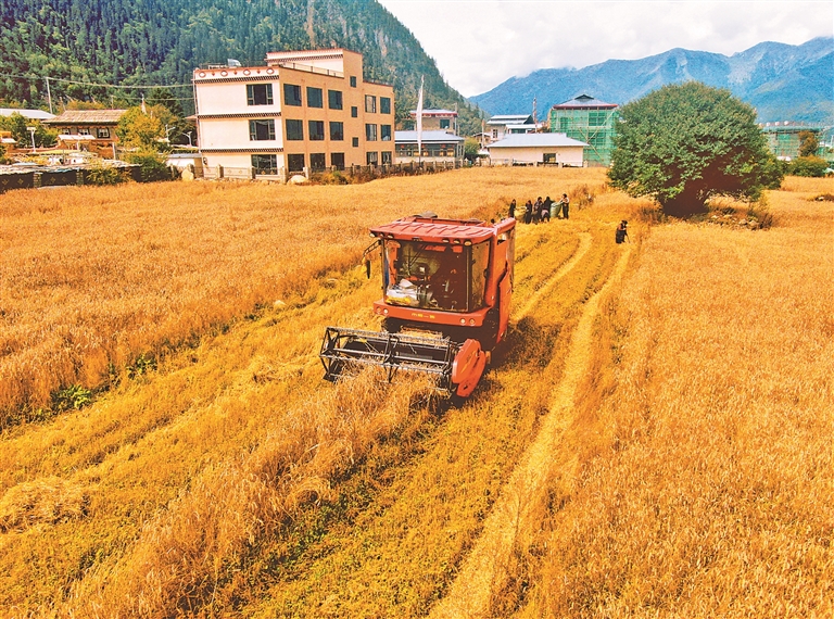 在拉薩市墨竹工卡縣唐加鄉(xiāng)莫沖村,田間地頭繁忙景象撲面而來。幾臺(tái)大型收割機(jī)轟鳴著在金色的農(nóng)田里來回穿梭,收割、脫粒一氣呵成,村民們跟在機(jī)器后方,有條不紊地進(jìn)行后續(xù)整理工作,呈現(xiàn)出一派熱火朝天的豐收?qǐng)鼍?。村民貢嘎頓玉向記者介紹,“我家共有37畝農(nóng)田,10畝種小油菜,27畝種青稞。以前全家4口上陣得忙上一個(gè)多月,現(xiàn)在有了機(jī)械化作業(yè),短短幾天就能完成所有秋收工作,既省時(shí)又省力?!?/p>