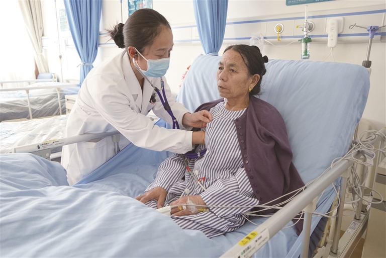 值班醫(yī)生為患者阿媽檢查身體情況。記者 芮怡星 攝