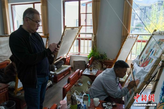 9月26日,哈薩克斯坦駐華大使努雷舍夫在西藏唐卡畫院觀看了解唐卡繪制過程。中新社記者 江飛波 攝