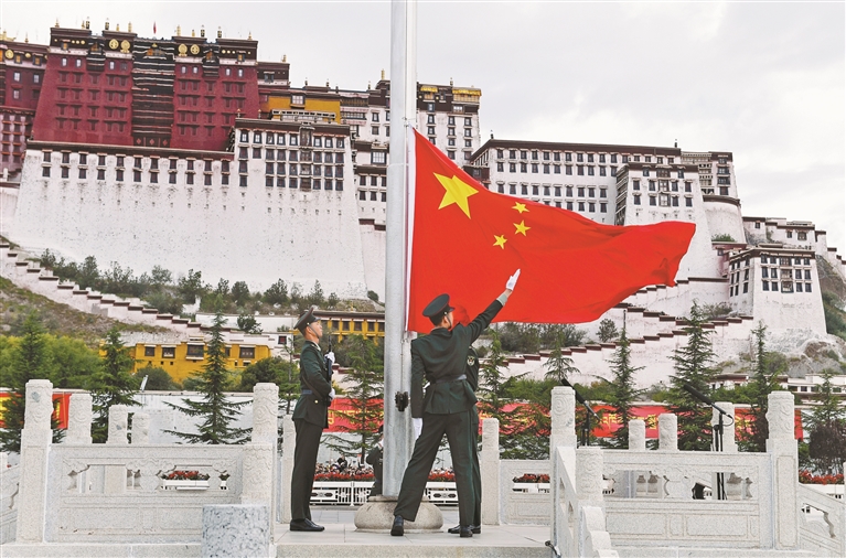 金秋十月舉國(guó)同慶,神州大地繁花似錦。10月1日上午,自治區(qū)慶祝中華人民共和國(guó)成立76周年“升國(guó)旗、唱國(guó)歌”儀式在布達(dá)拉宮廣場(chǎng)舉行。圖為儀式現(xiàn)場(chǎng)。記者 旦增蘭澤 攝