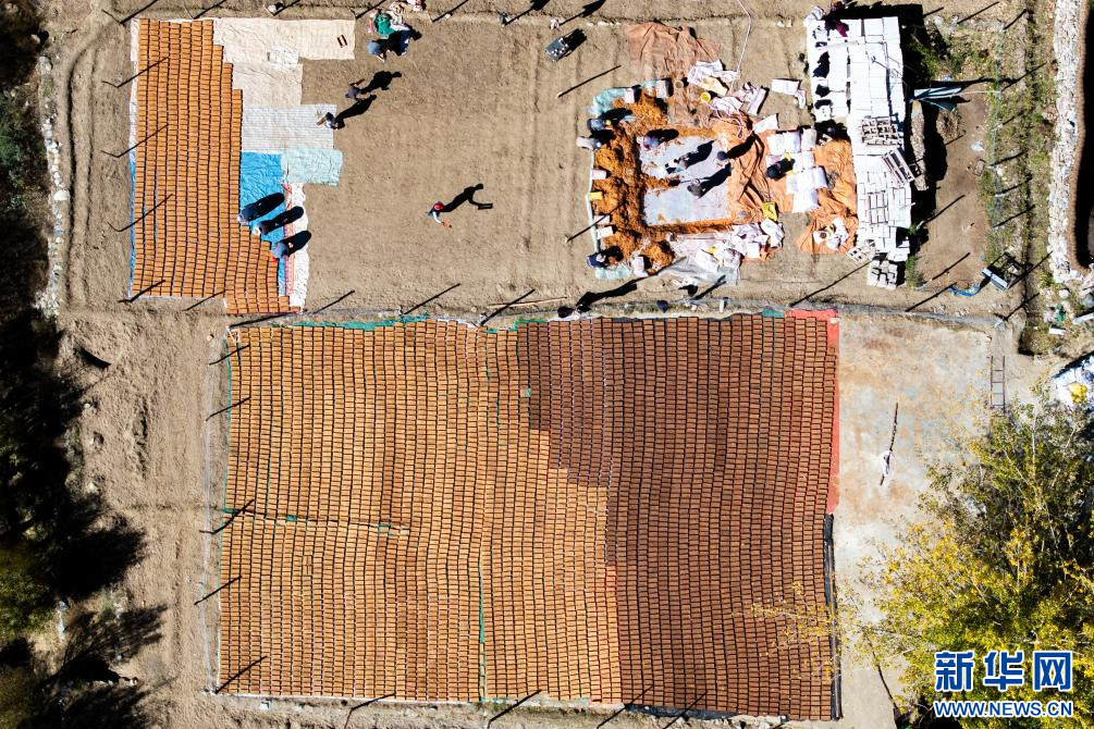 10月17日,西藏拉薩市尼木縣吞巴鎮(zhèn)吞達(dá)村村民把經(jīng)過(guò)水磨后的柏木漿制作成香磚(無(wú)人機(jī)照片)。新華網(wǎng) 旦增努布 攝