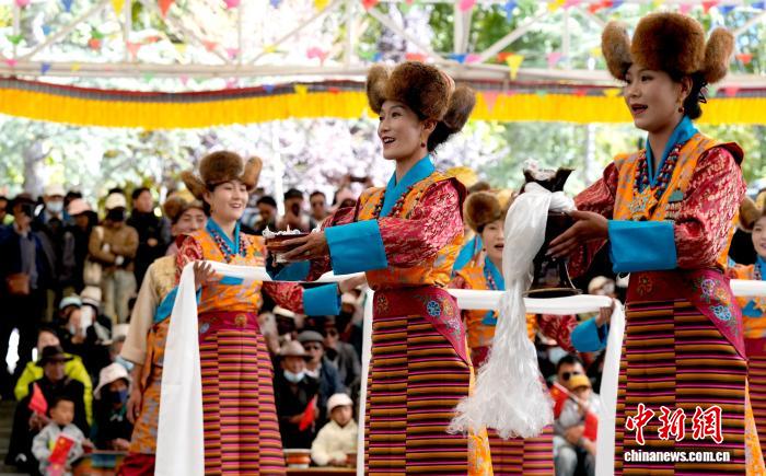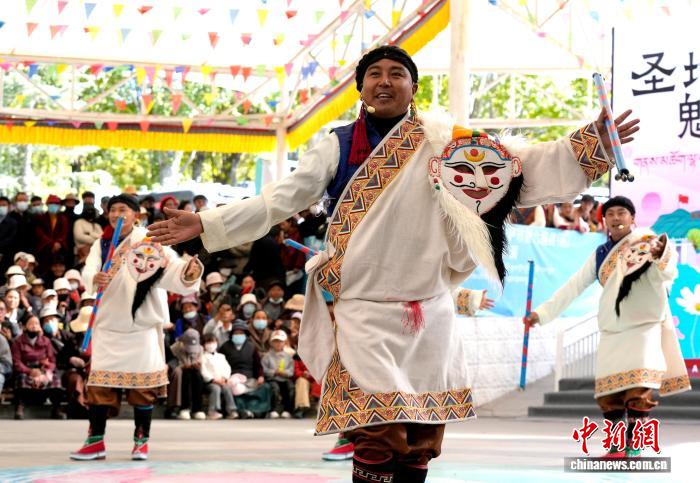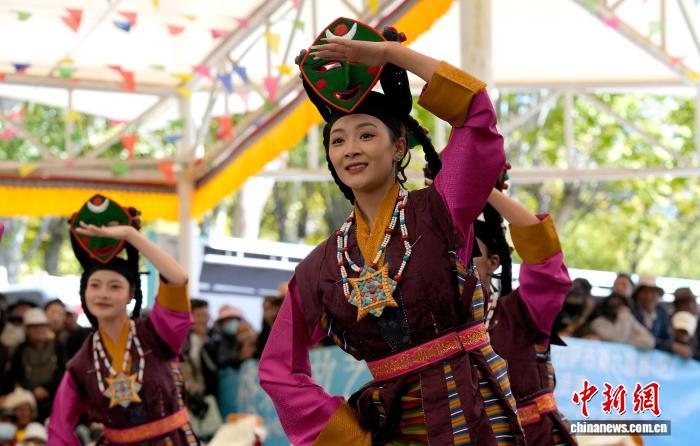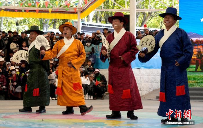 10月19日,“格?;ū崩_市第六屆縣(區(qū))藝術團文藝調演頒獎活動在布達拉宮腳下的宗角祿康公園舉行。現場,拉薩市各縣(區(qū))藝術團帶來精彩節(jié)目。圖為文藝調演頒獎活動上的文藝表演。中新社記者 李林 攝
