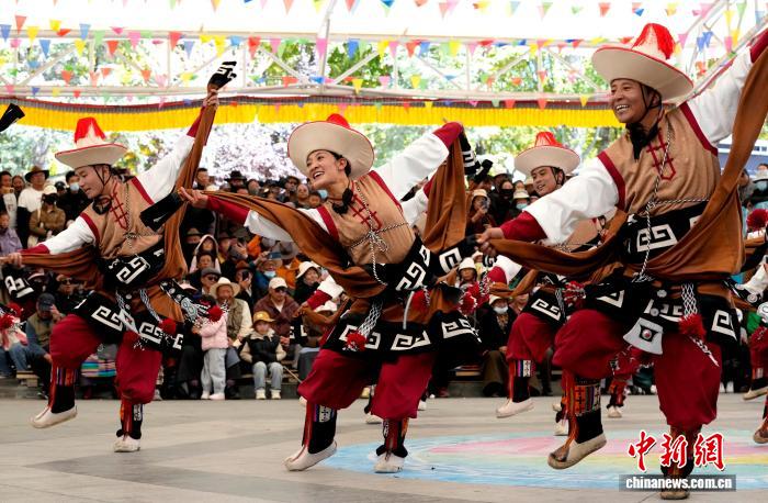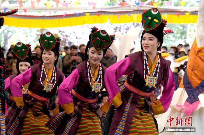 10月19日,“格?;ū崩_市第六屆縣(區(qū))藝術團文藝調演頒獎活動在布達拉宮腳下的宗角祿康公園舉行?,F場,拉薩市各縣(區(qū))藝術團帶來精彩節(jié)目。圖為文藝調演頒獎活動上的文藝表演。中新社記者 李林 攝
