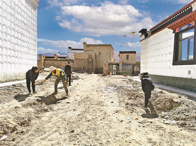 拉孜縣查務鄉(xiāng)那布西村干部、駐村工作隊隊員測量重建后的村道距離,初步確定群眾圍墻修建范圍。