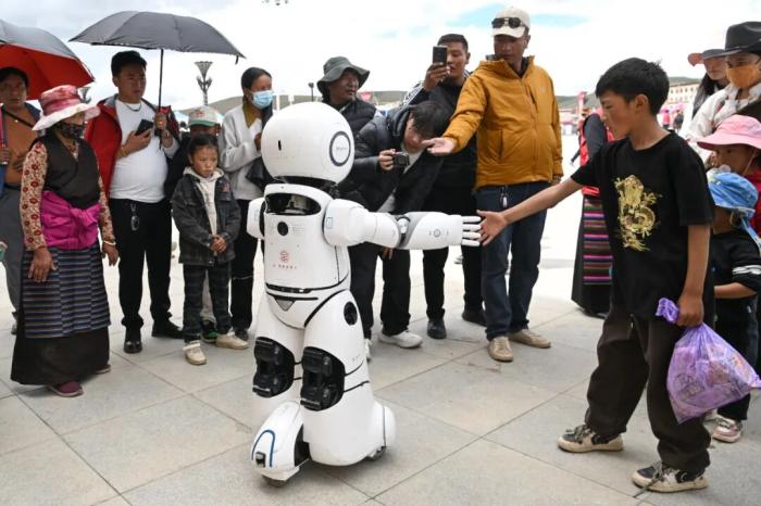 2025年9月6日,在西藏那曲市恰青賽馬節(jié)現(xiàn)場,機(jī)器人的驚喜亮相,吸引前來觀賽的民眾與其互動。中新社記者 貢嘎來松 攝