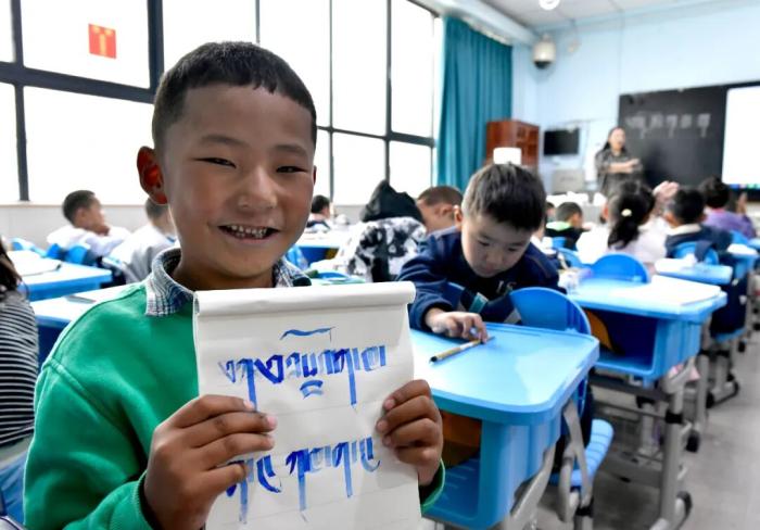 2024年8月20日,拉薩市第一小學(xué)一年級八班迎來藏語文課。圖為學(xué)生展示書寫的藏文。中新社記者 李林 攝