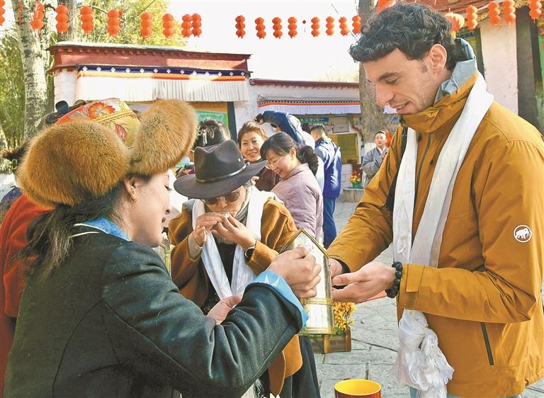 近日,在羅布林卡景區(qū),中外游客共品青稞美酒,感受民俗風情。記者 王敏 攝