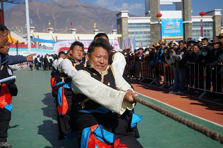 記者置身于賽場(chǎng),最直觀的感受并非競(jìng)技的緊張,而是一種蓬勃的生命力在盡情舒展。這里的比賽,吶喊聲帶著鄉(xiāng)音,勝利的歡呼與田間勞作時(shí)的號(hào)子相互呼應(yīng)。在極具特色的“押加”比賽(即大象拔河)現(xiàn)場(chǎng),來自隆子縣的扎西達(dá)杰成為全場(chǎng)的焦點(diǎn)。他穿著隆子縣的傳統(tǒng)服飾,面容質(zhì)樸神情嚴(yán)肅,裁判哨聲吹響,與對(duì)手反向?qū)乃查g,他全身的肌肉瞬間繃緊,四肢緊緊地“吸附”在地上,那是在千百次揮鎬、背負(fù)牧草中錘煉出的力量。僵持、角力,在鄉(xiāng)親的“加油”聲中,他猛然發(fā)力,贏得了比賽。
